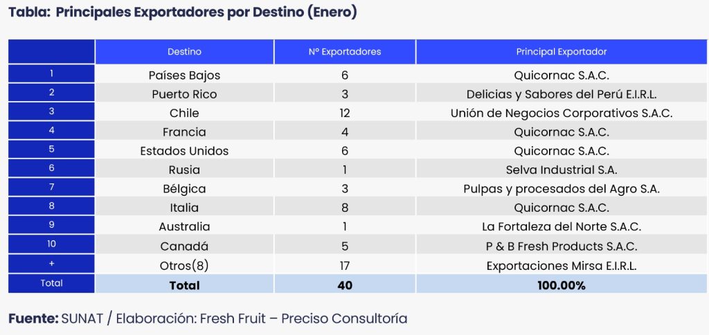 Puerto Rico se ubicó como el segundo mercado más importante, concentrando alrededor del 21% del total exportado. Los despachos alcanzaron los US$ 587 mil y 176 toneladas, con un precio promedio de US$ 3.34 por kilogramo, uno de los más altos entre los principales destinos. Las empresas Delicias y Sabores del Perú E.I.R.L. y Frutos Tongorrape S.A. lideraron los envíos hacia este mercado, reflejando una estrategia enfocada en destinos con mayor valorización del producto.