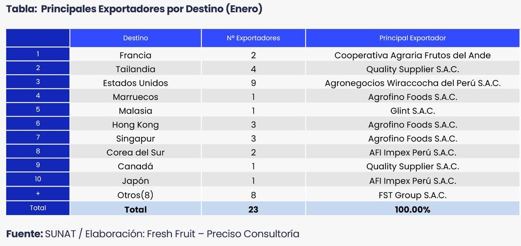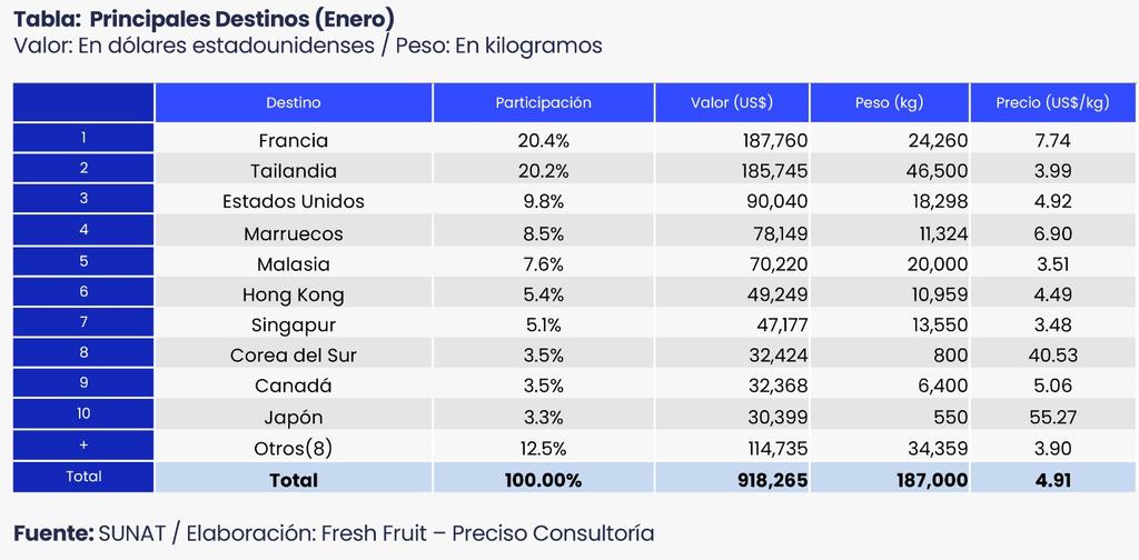 Tailandia ocupó el segundo lugar entre los destinos, con una participación también cercana al 20% del valor exportado. Los despachos alcanzaron los US$ 185.7 mil, con un volumen aproximado de 47 toneladas y un precio promedio de US$ 3.99 por kilogramo. En este mercado destacaron Quality Supplier S.A.C. y Agritrade S.R.L., dos de los cuatro exportadores presentes, reflejando también una estructura de oferta relativamente concentrada.