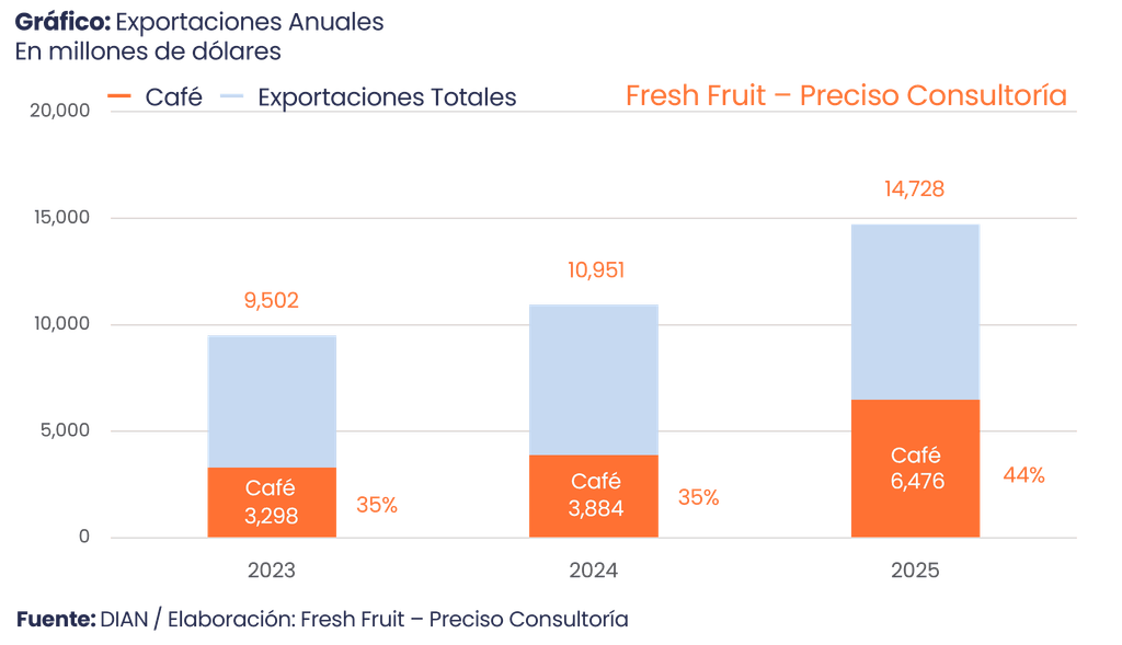 En 2025, el agro colombiano alcanzó US$ 14,728 millones (+35%, +US$ 3,776 millones), desde US$ 10,951 millones en 2024. El salto combinó dos motores: más cantidad y mejor precio. El volumen exportado pasó de 5.56 millones a 6.69 millones de toneladas (+20%), y el precio subió de US$ 1.97/kg a US$ 2.20/kg (+12%). El desempeño tuvo un protagonista claro.