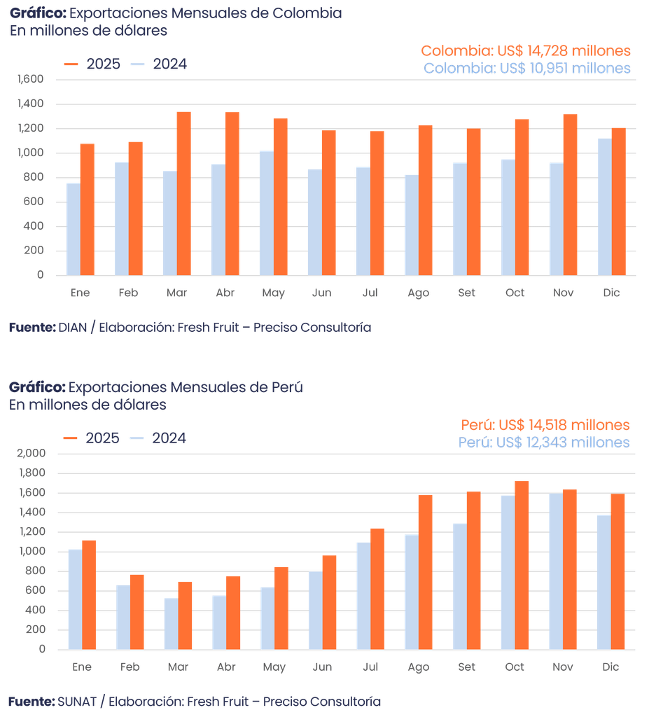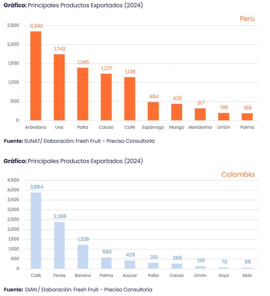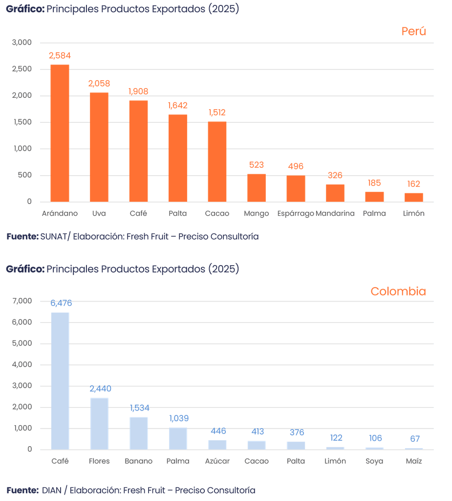Perú exportó US$ 14,518 millones, prácticamente el mismo orden agroexportadora que Colombia (US$ 14,728 millones). La diferencia es pequeña (US$ 210 millones, 1.4%). La diferencia relevante es la composición. Perú llega como portafolio, con liderazgo repartido entre arándano (US$ 2,584 millones), uva (US$ 2,058 millones), café (US$ 1,908 millones), palta (US$ 1,642 millones) y cacao (US$ 1,512 millones). Colombia llega como especialización, con café cerca de la mitad del total. En términos de riesgo, Perú tiende a amortiguar ciclos por diversificación; Colombia captura saltos grandes cuando el café acompaña, pero queda más expuesta a una normalización de precios.