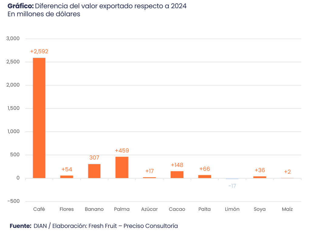 El siguiente escalón lo definieron tres rubros de tamaño relevante, pero con historias distintas. Banano llegó a US$ 1,534 millones (+25%), reforzando su peso como producto de escala y continuidad. Palma fue el gran “sorpresivo” del año: subió a US$ 1,039 millones (+79%) desde US$ 580 millones, una variación que lo convierte en el segundo aporte más importante al crecimiento después del café. Azúcar, en cambio, avanzó poco: US$ 446 millones (+4%), por debajo del ritmo del agregado, por lo que pierde participación relativa en un año tan expansivo.