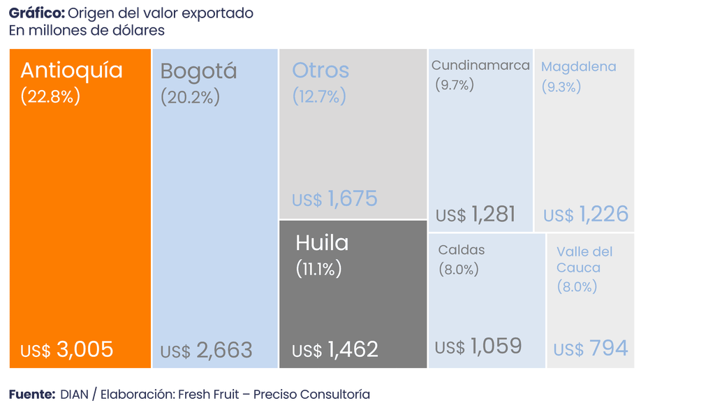La geografía exportadora es consistente con la concentración sectorial. En 2025, AntioquÍa registró US$ 3,300 millones y Bogotá D.C. US$ 2,966 millones; juntas explican 43% del total. Luego aparecen Cundinamarca (US$ 1,482 millones), Huila (US$ 1,463 millones), Magdalena (US$ 1,235 millones) y Caldas (US$ 1,189 millones). El crecimiento también estuvo concentrado: Antioquia, Bogotá y Huila explicaron cerca de tres quintos del aumento anual; al sumar Magdalena y Caldas, se alcanza aproximadamente cuatro quintos.