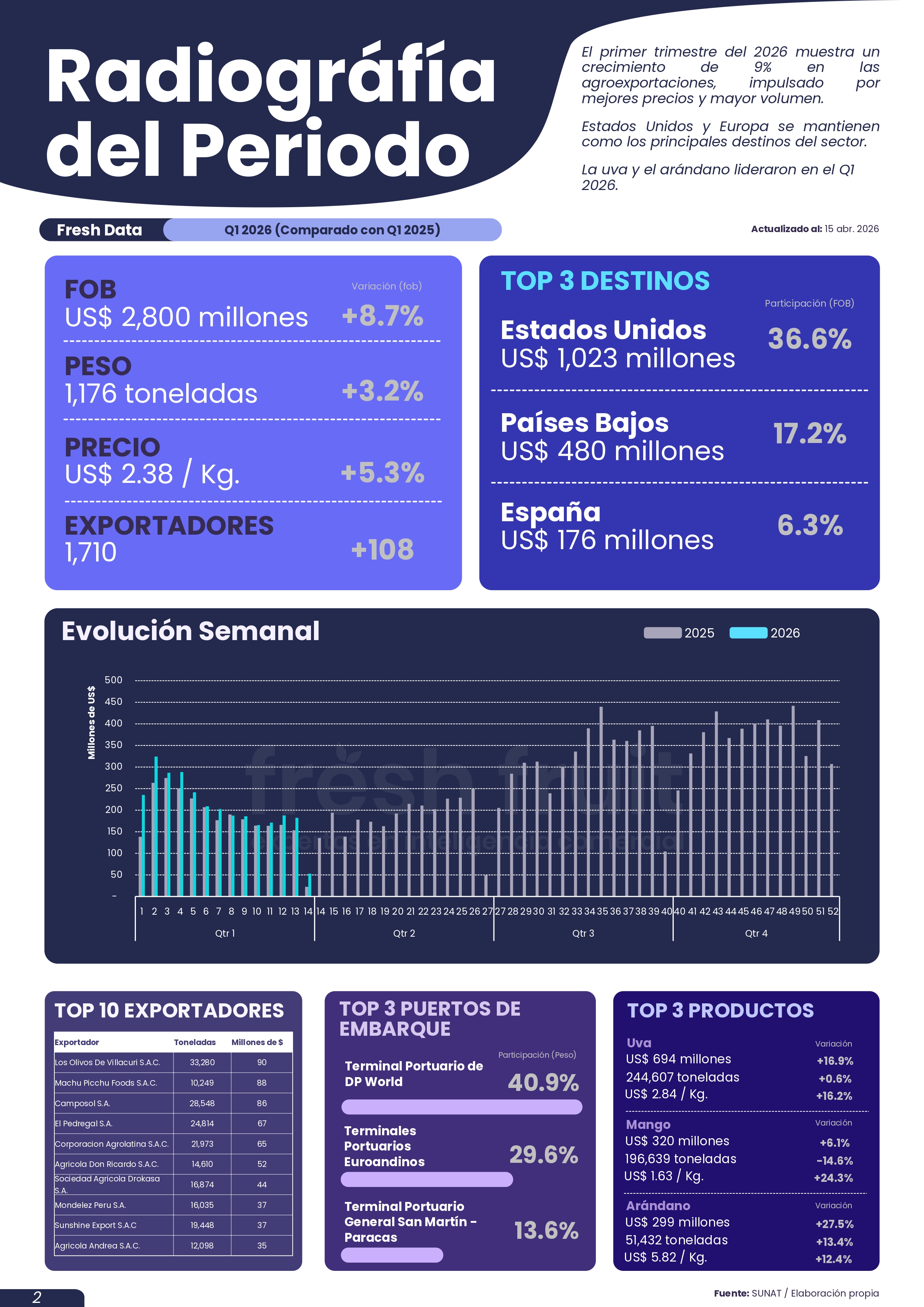 En el plano empresarial, alrededor de 1,700 empresas realizaron envíos agrícolas en el primer trimestre de 2026. De este total, 63 superaron los US$ 10 millones, entre las cuales 13 excedieron los US$ 30 millones y tres bordean los US$ 90 millones.